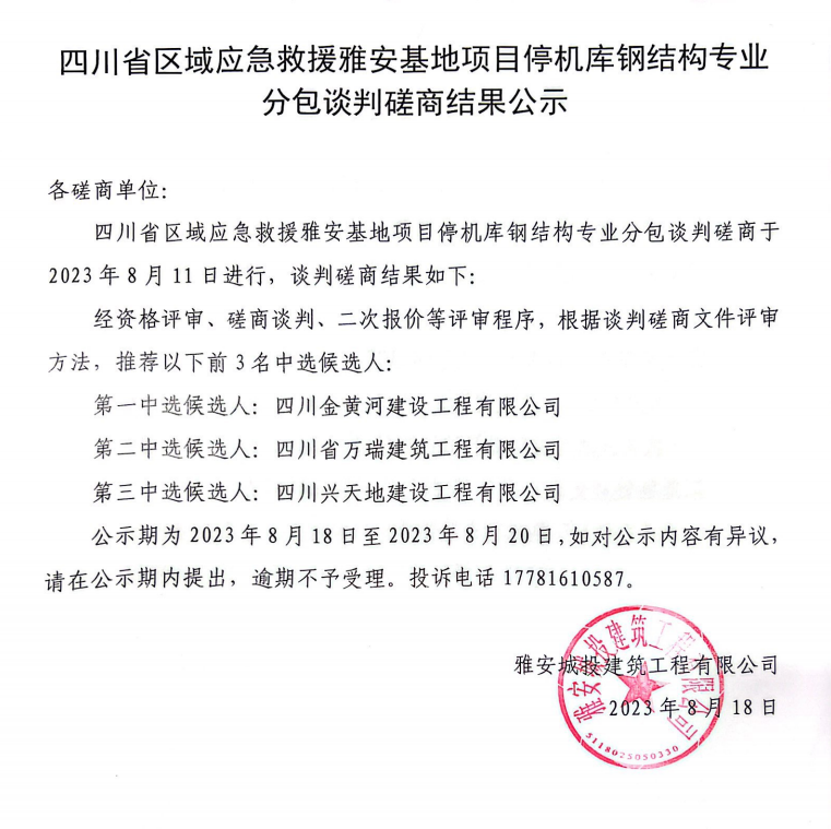 四川省區(qū)域應(yīng)急救援雅安基地項(xiàng)目停機(jī)庫鋼結(jié)構(gòu)專業(yè)分包談判磋商結(jié)果公示