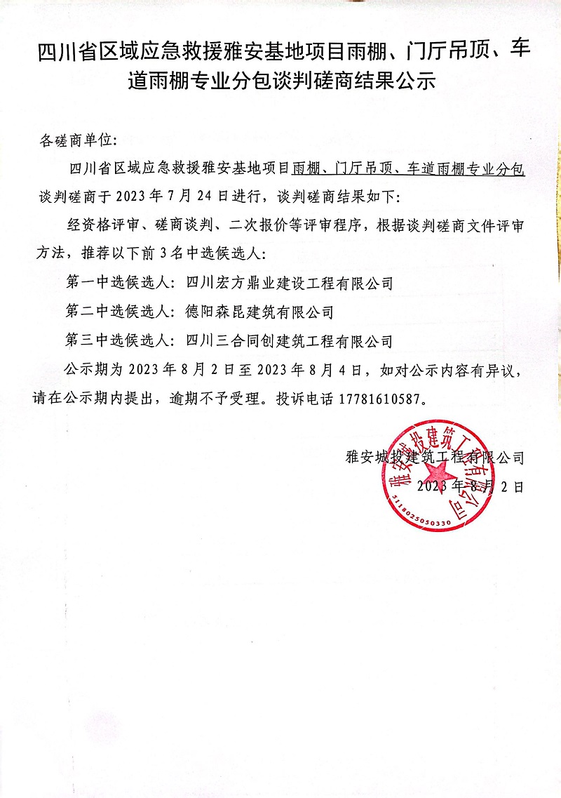 四川省區(qū)域應急救援雅安基地項目雨棚、門廳吊頂、車道雨棚專業(yè)分包談判磋商結(jié)果公示