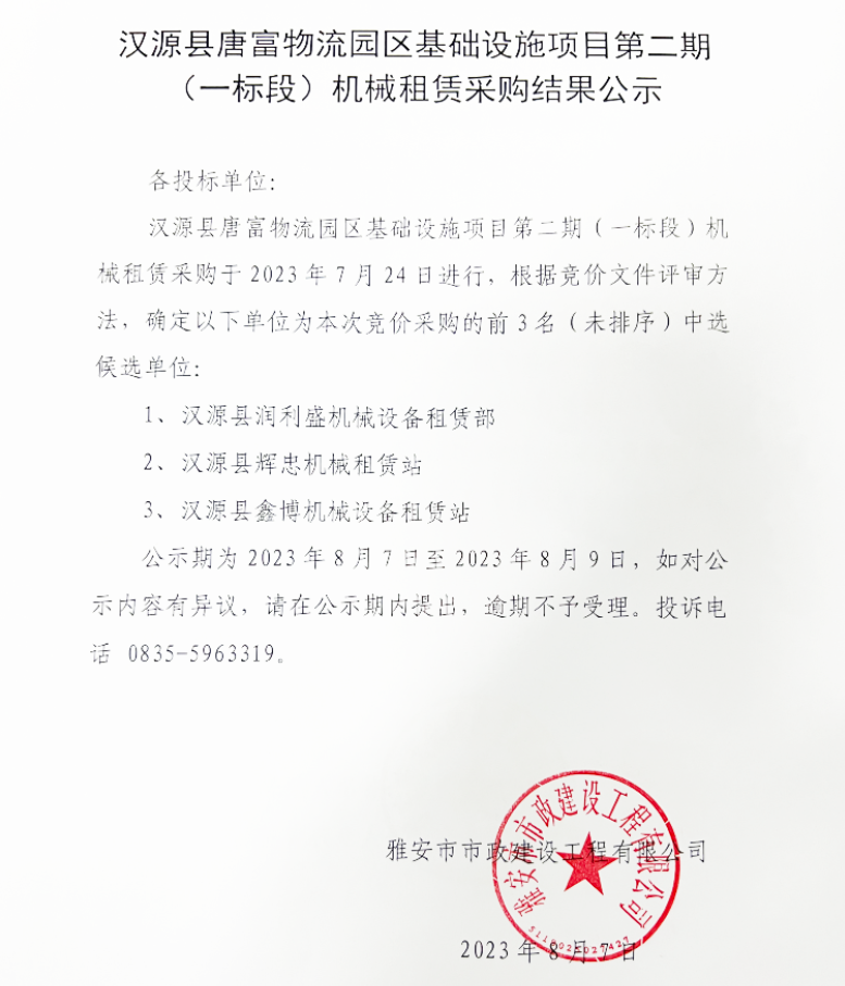 漢源縣唐富物流園區(qū)基礎(chǔ)設(shè)施項(xiàng)目第二期(一標(biāo)段)機(jī)械租賃采購(gòu)結(jié)果公示