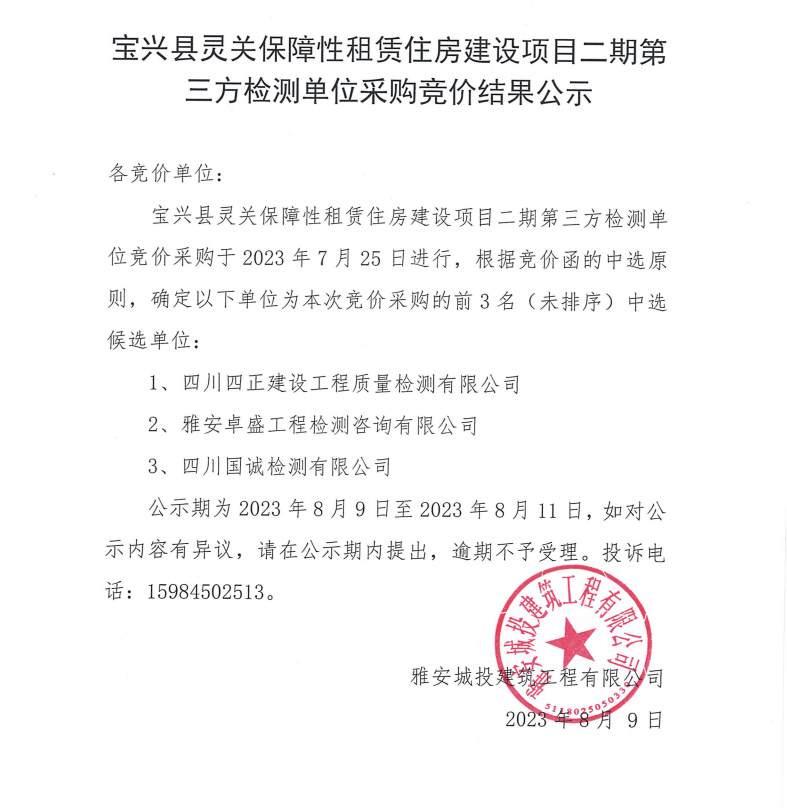 寶興縣靈關(guān)保障性租賃住房建設(shè)項(xiàng)目二期第三方檢測單位采購競價結(jié)果公示