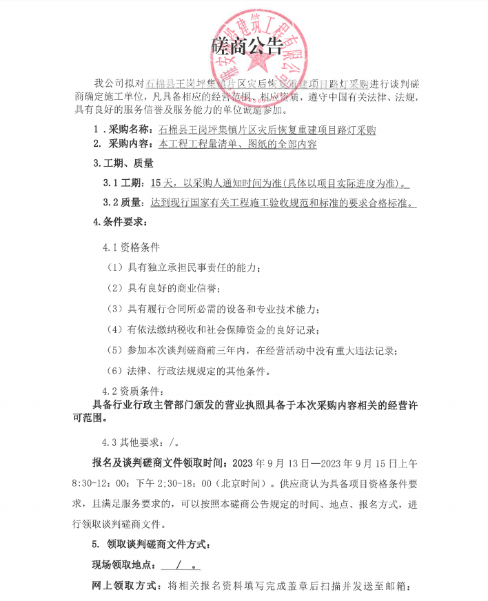 石棉縣王崗坪集鎮(zhèn)片區(qū)災后恢復重建項目路燈采購談判磋商公告