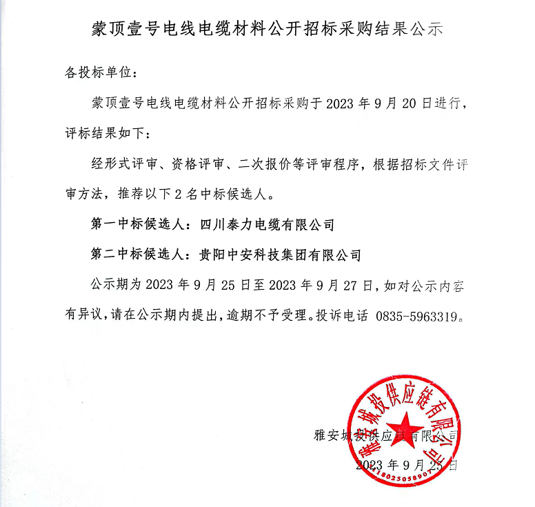 蒙頂壹號(hào)電線(xiàn)電纜材料公開(kāi)招標(biāo)采購(gòu)結(jié)果公示