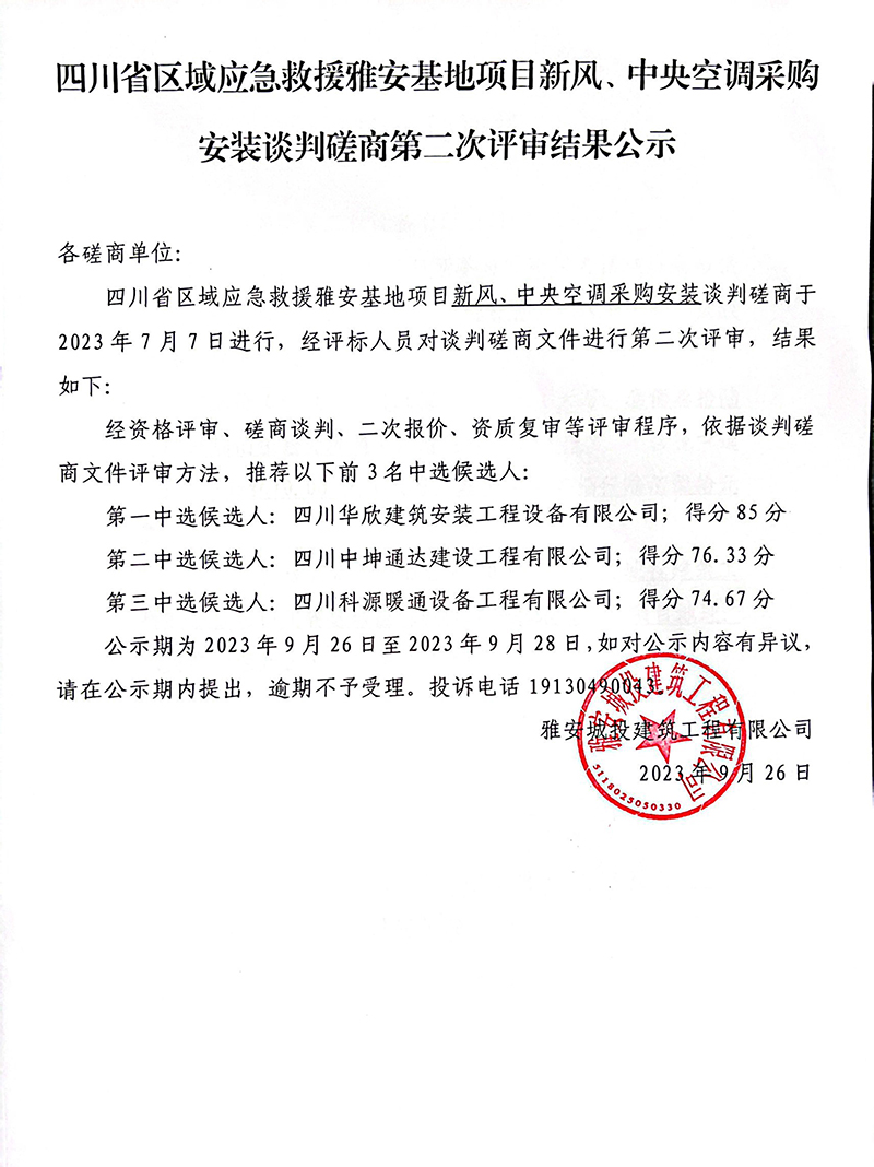 四川省區(qū)域應(yīng)急救援雅安基地項目新風(fēng)、中央空調(diào)采購安裝談判磋商第二次評審結(jié)果公示