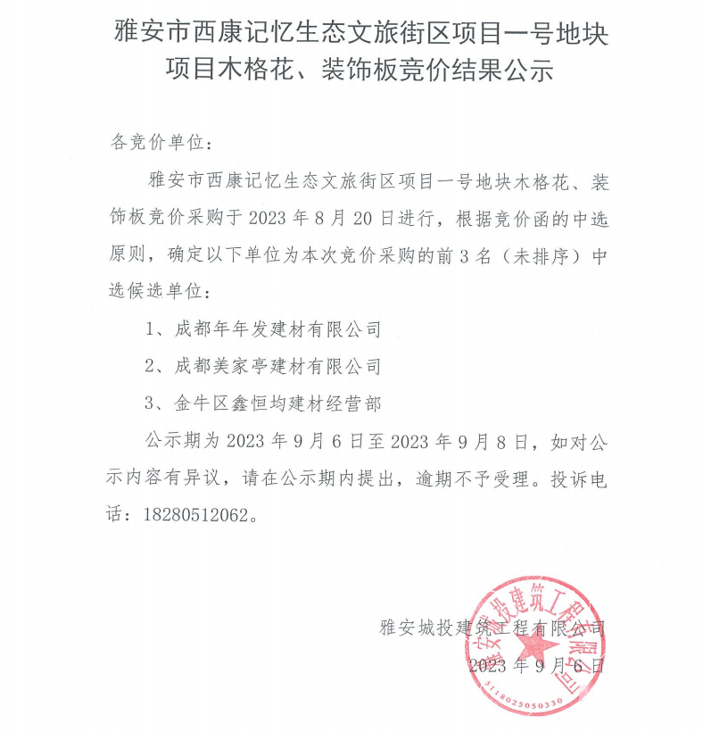雅安市西康記憶生態(tài)文旅街區(qū)項目一號地塊項目木格花、裝飾板競價結(jié)果公示