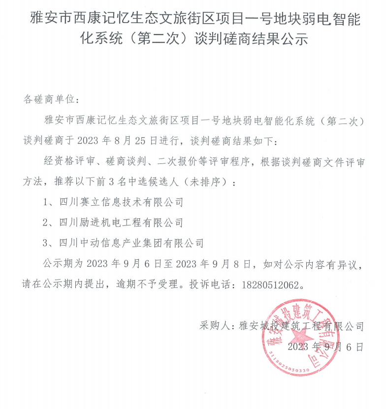 雅安市西康記憶生態(tài)文旅街區(qū)項目一號地塊弱電智能化系統(tǒng)(第二次) 談判磋商結果公示