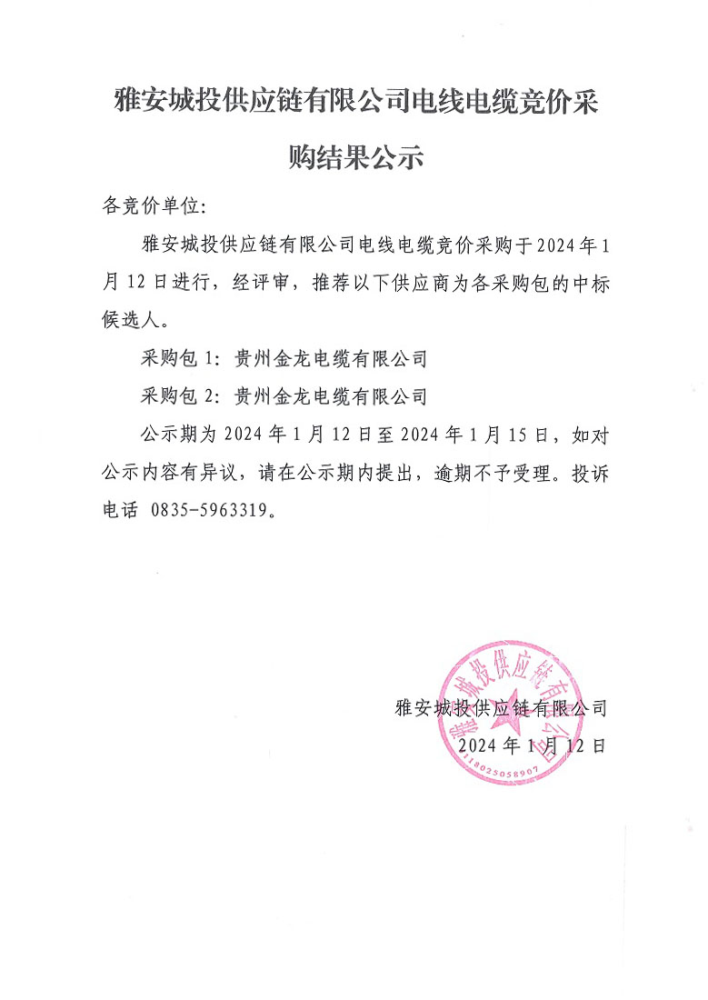 雅安城投供應(yīng)鏈有限公司電線電纜競(jìng)價(jià)采購(gòu)結(jié)果公示