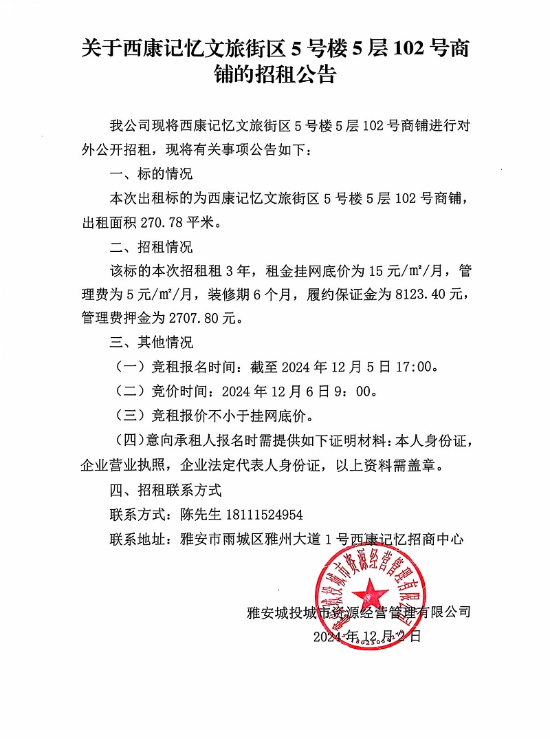 關(guān)于西康記憶文旅街區(qū)5號樓5層102號商鋪的招租公告