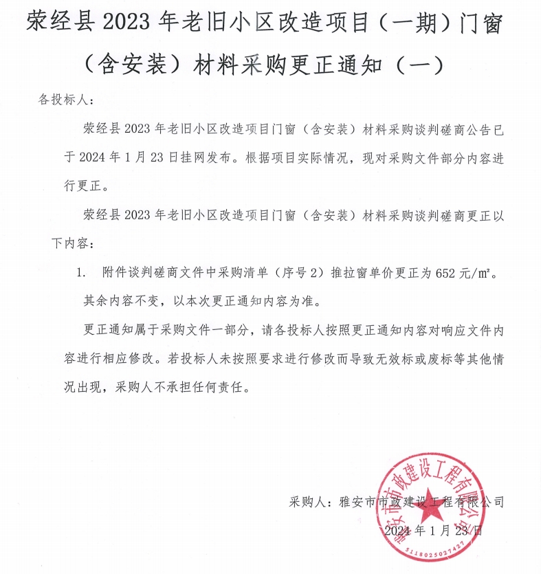 滎經(jīng)縣2023年老舊小區(qū)改造項目(一期)門窗(含安裝)材料采購更正通知(一)