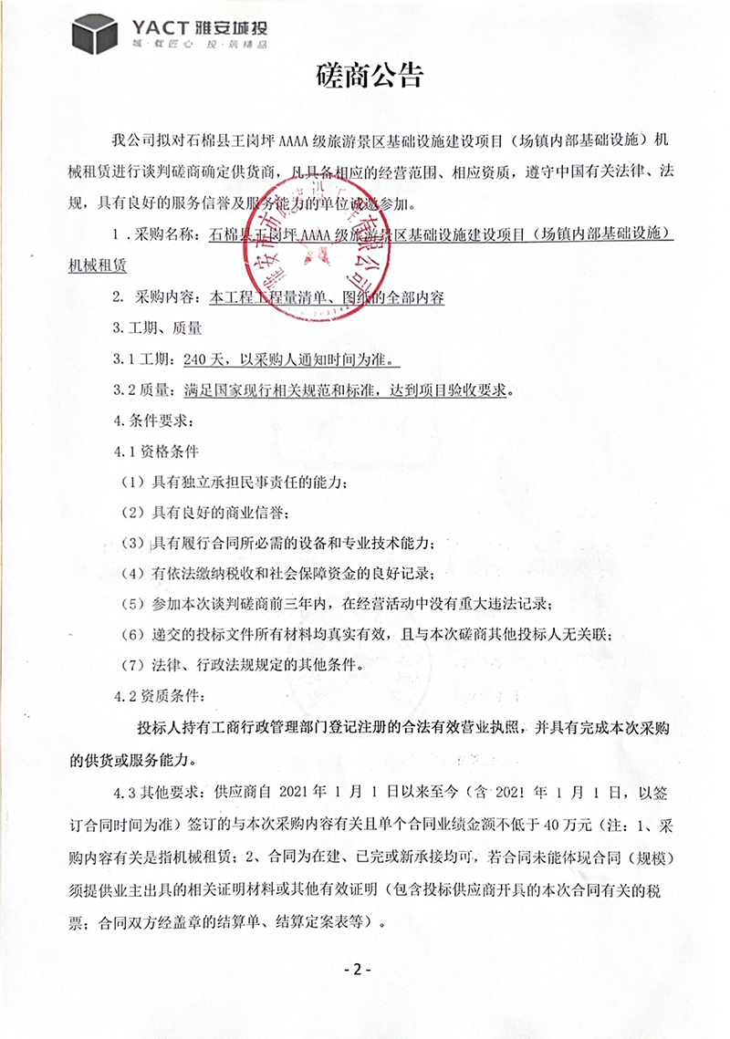 石棉縣王崗坪AAAA級(jí)旅游景區(qū)基礎(chǔ)設(shè)施建設(shè)項(xiàng)目(場(chǎng)鎮(zhèn)內(nèi)部基礎(chǔ)設(shè)施)機(jī)械租賃