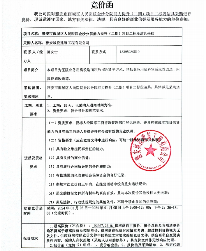 雅安市雨城區(qū)人民醫(yī)院金沙分院能力提升(二期)項目二標(biāo)段潔具采購競價公告