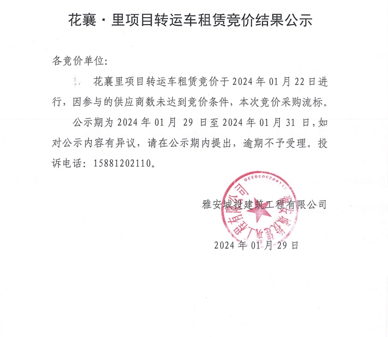 花襄·里項(xiàng)目轉(zhuǎn)運(yùn)車租賃競(jìng)價(jià)結(jié)果公示