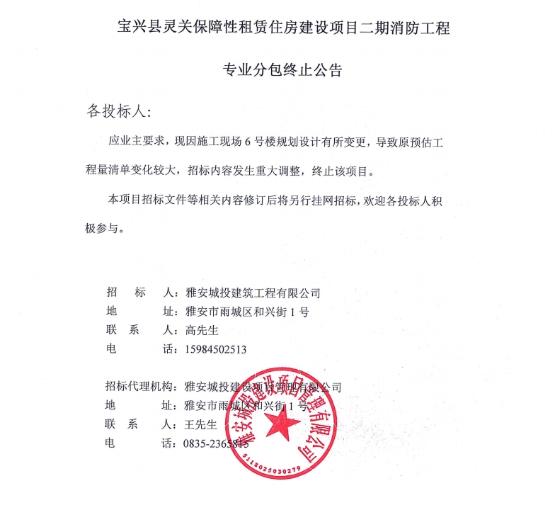 寶興縣靈關保障性租賃住房建設項目二期消防工程專業(yè)分包終止公告