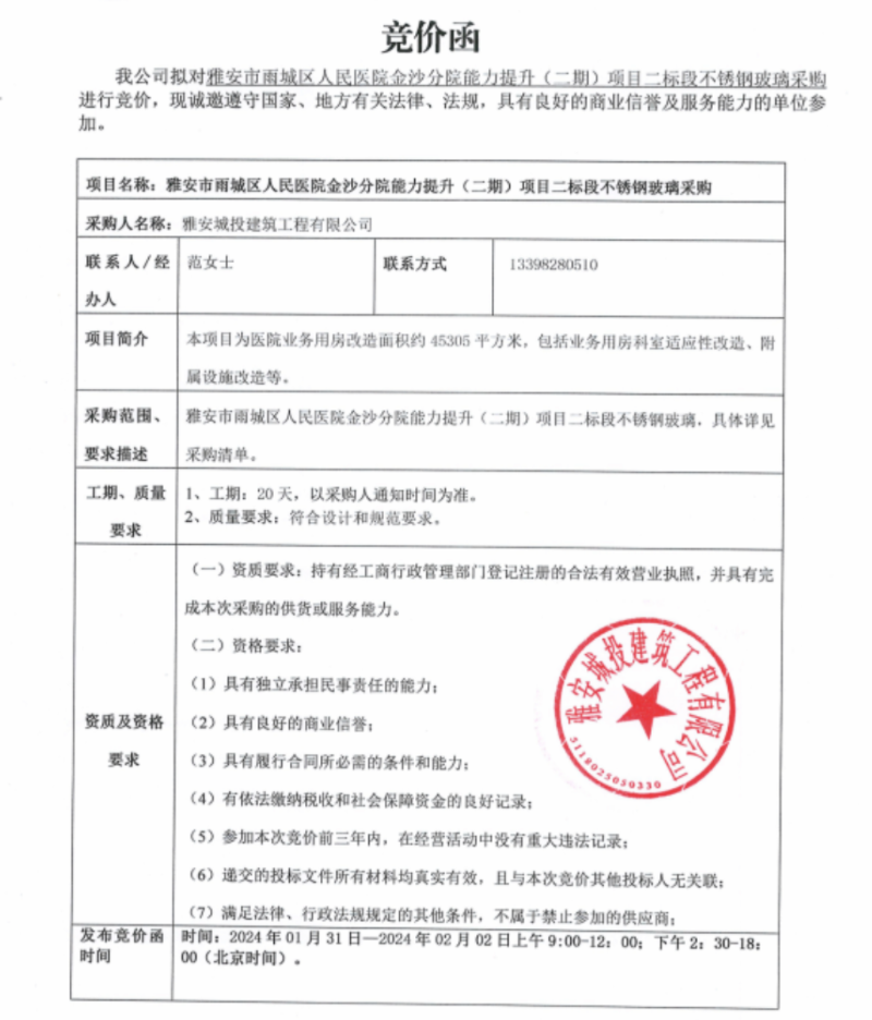 雅安市雨城區(qū)人民醫(yī)院金沙分院能力提升(二期)項(xiàng)目二標(biāo)段不銹鋼玻璃采購競(jìng)價(jià)公告