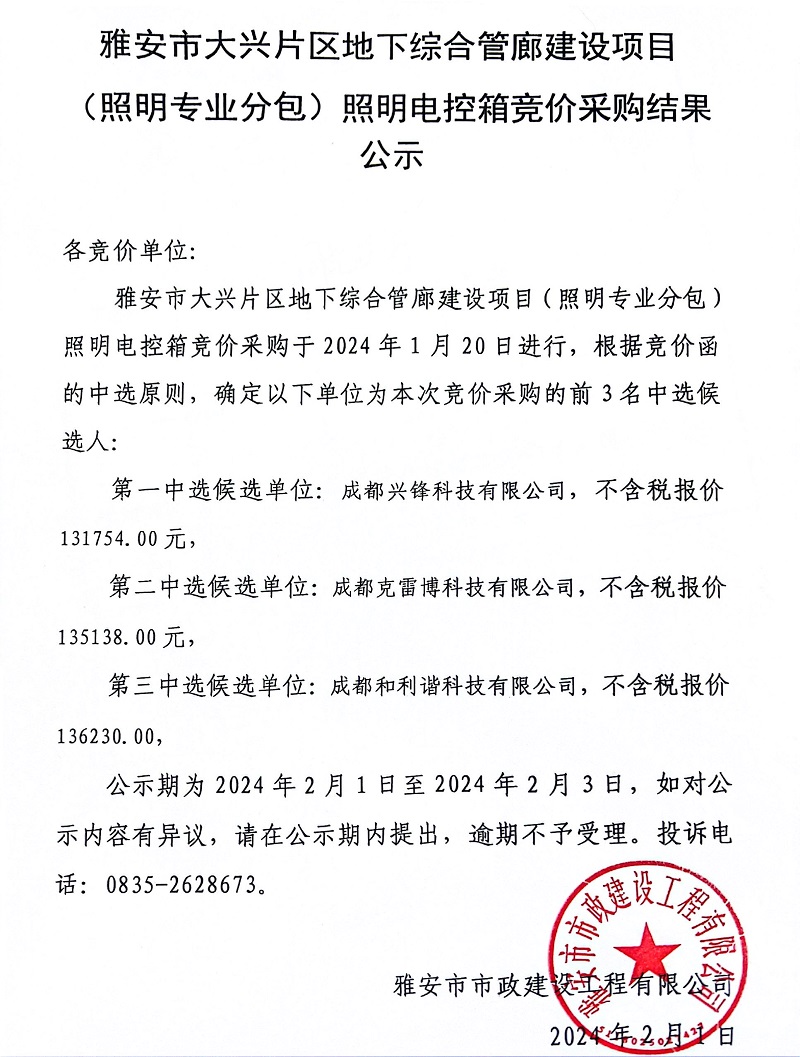 雅安市大興片區(qū)地下綜合管廊建設(shè)項目(照明專業(yè)分包)照明電控箱競價采購結(jié)果公示