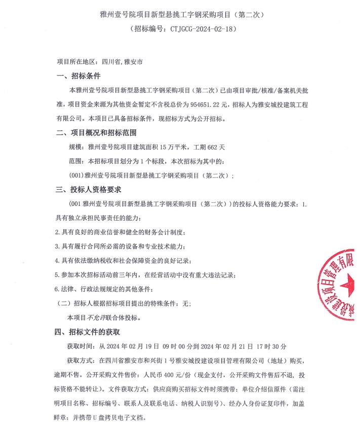 雅州壹號院項目新型懸挑工字鋼采購項目(第二次)公告