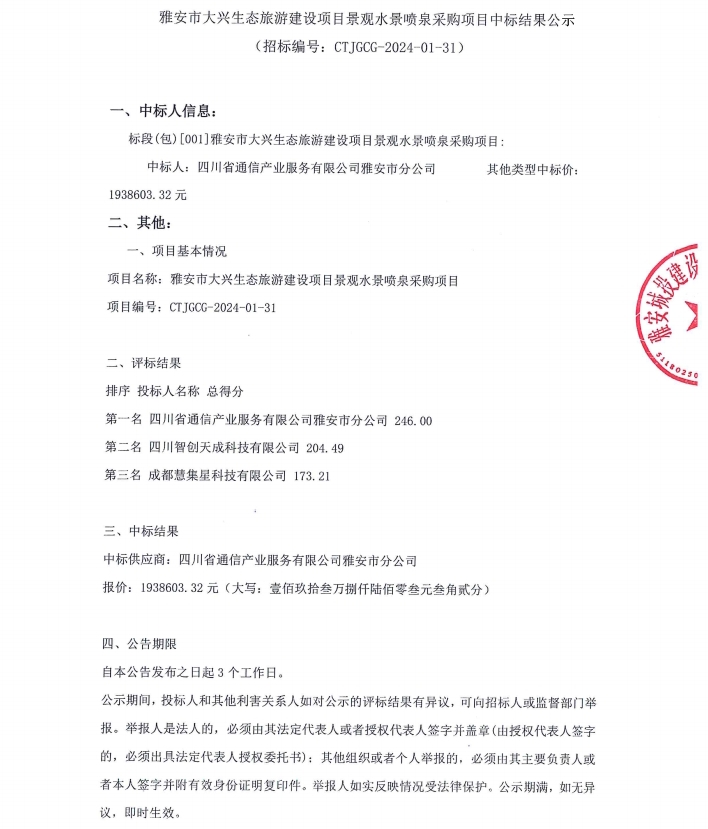 雅安市大興生態(tài)旅游建設(shè)項(xiàng)目景觀水景噴泉采購(gòu)項(xiàng)目中標(biāo)結(jié)果公示