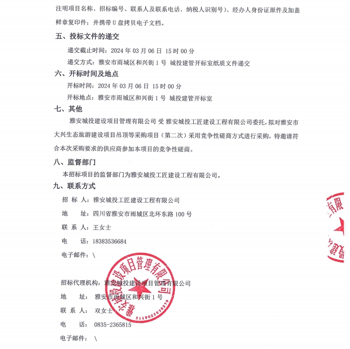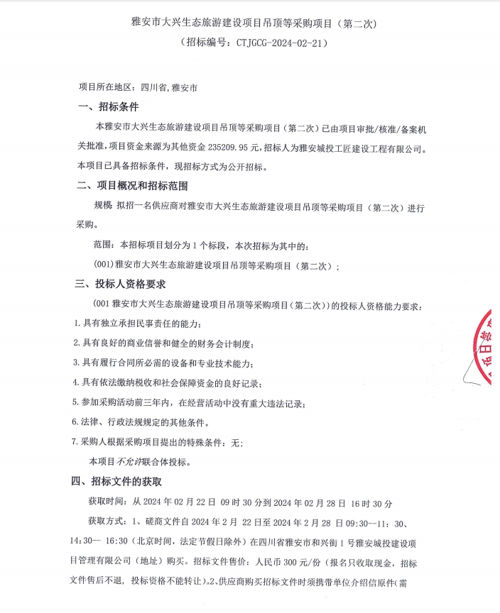 雅安市大興生態(tài)旅游建設項目吊頂等采購項目(第二次)公告