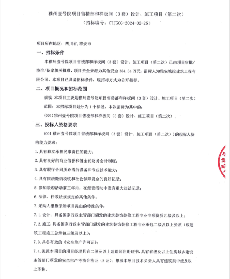 雅州壹號(hào)院項(xiàng)目售樓部和樣板間(3套)設(shè)計(jì)、施工項(xiàng)目(第二次)公告