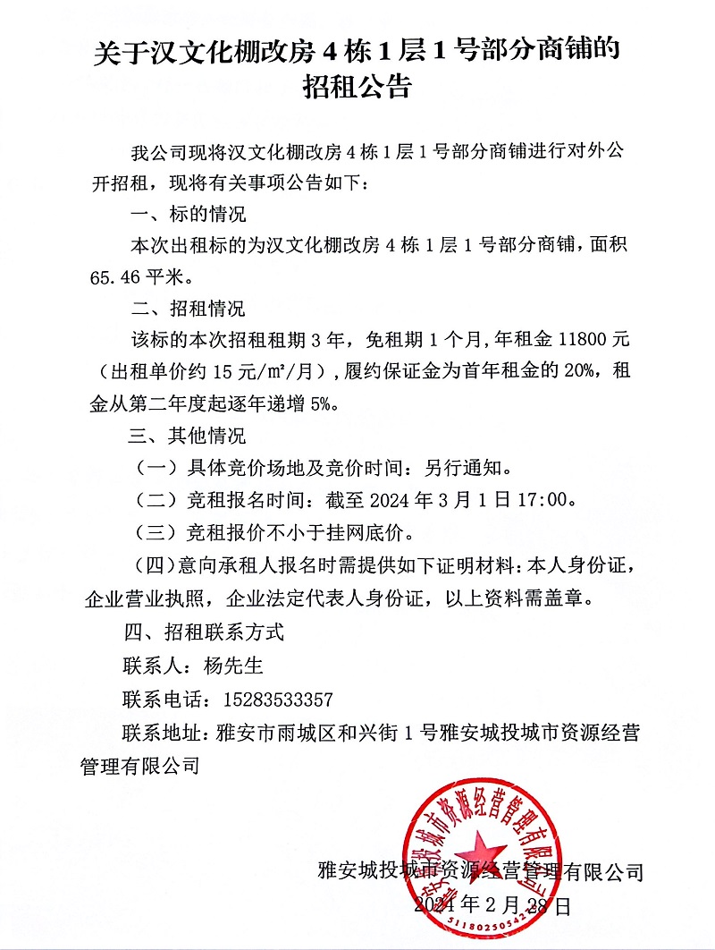 關(guān)于漢文化棚改房4棟1層1號(hào)部分商鋪的招租公告