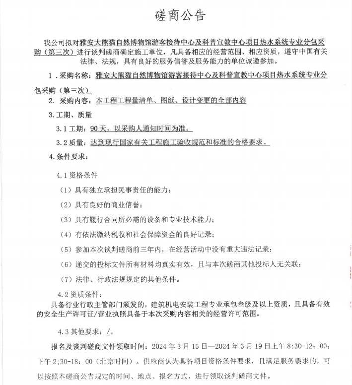 雅安大熊貓自然博物館游客接待中心及科普宣教中心項目熱水系統(tǒng)專業(yè)分包采購(第三次)磋商公告
