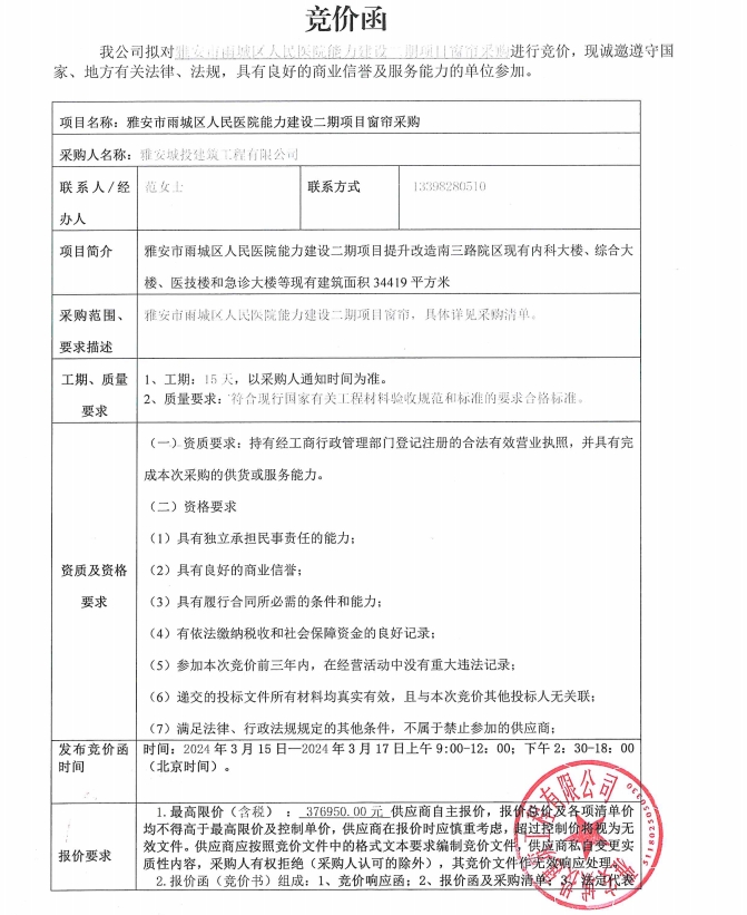 雅安市雨城區(qū)人民醫(yī)院能力建設(shè)二期項(xiàng)目窗簾采購競價(jià)公告