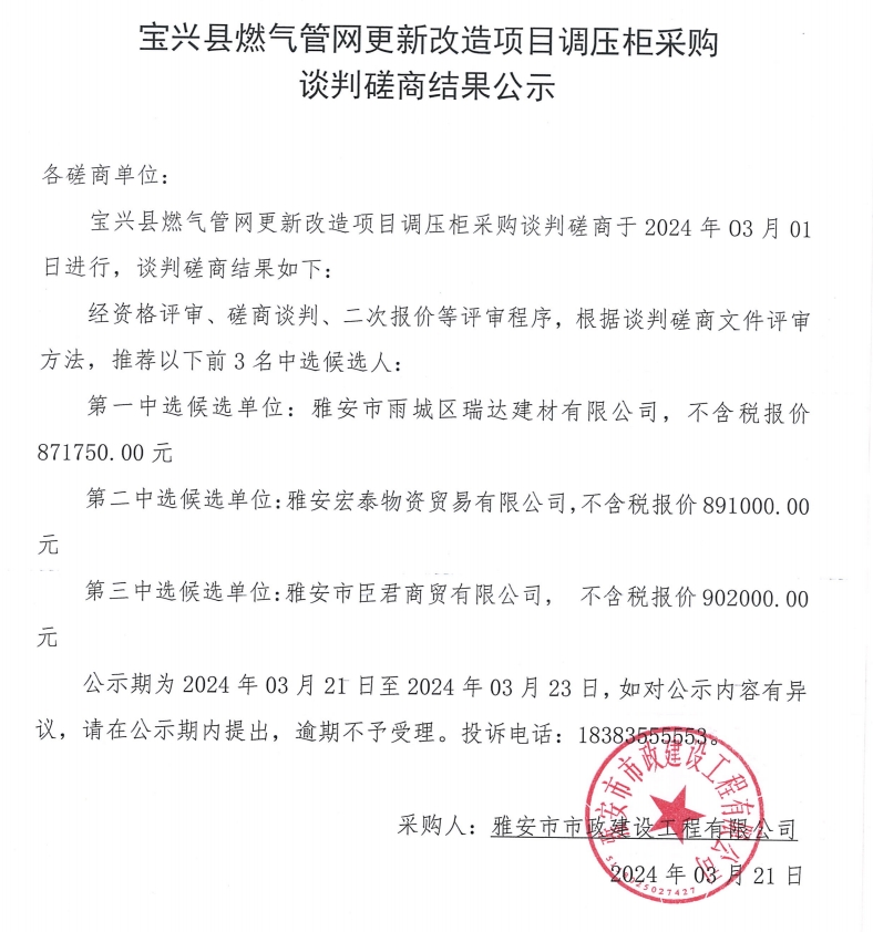 寶興縣燃氣管網(wǎng)更新改造項目調(diào)壓柜采購談判磋商結果公示