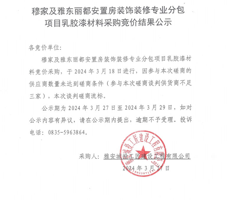 穆家及雅東麗都安置房裝飾裝修專(zhuān)業(yè)分包項(xiàng)目乳膠漆材料采購(gòu)競(jìng)價(jià)結(jié)果公示