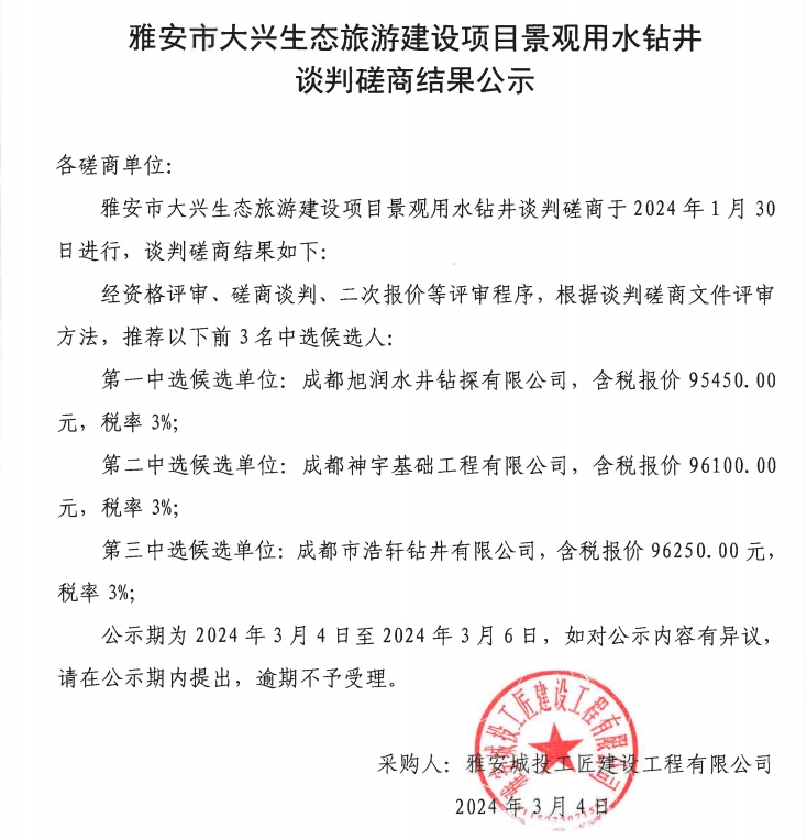 雅安市大興生態(tài)旅游建設項目景觀用水鉆井談判磋商結果公示