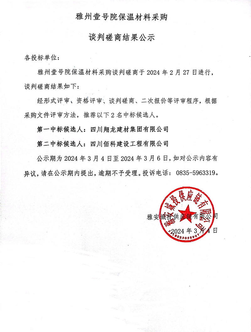 雅州壹號(hào)院保溫材料采購(gòu)談判磋商結(jié)果公示