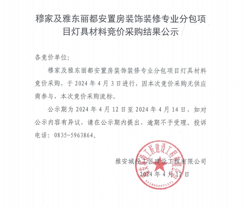 穆家及雅東麗都安置房裝飾裝修專業(yè)分包項(xiàng)目燈具材料競價采購結(jié)果公示