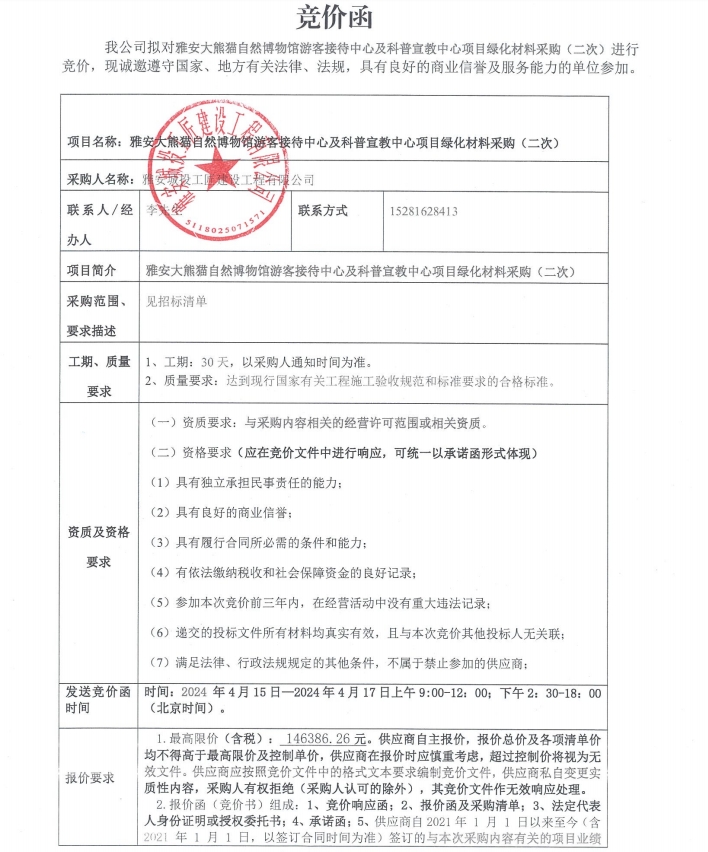 雅安大熊貓自然博物館游客接待中心及科普宣教中心項(xiàng)目綠化材料采購(gòu)(二次)競(jìng)價(jià)公告