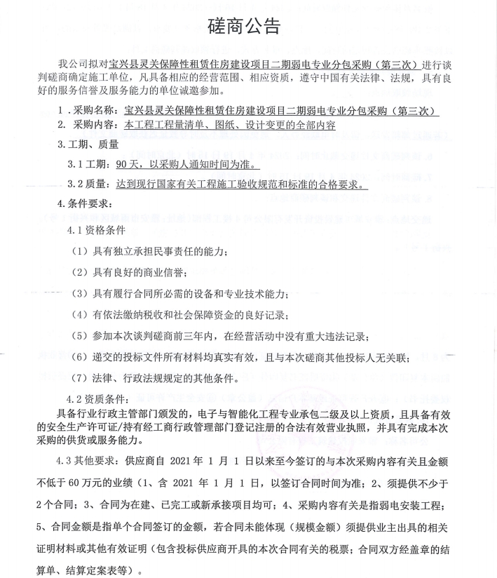 寶興縣靈關(guān)保障性租賃住房建設(shè)項目二期弱電工程專業(yè)分包采購(第三次)磋商公告