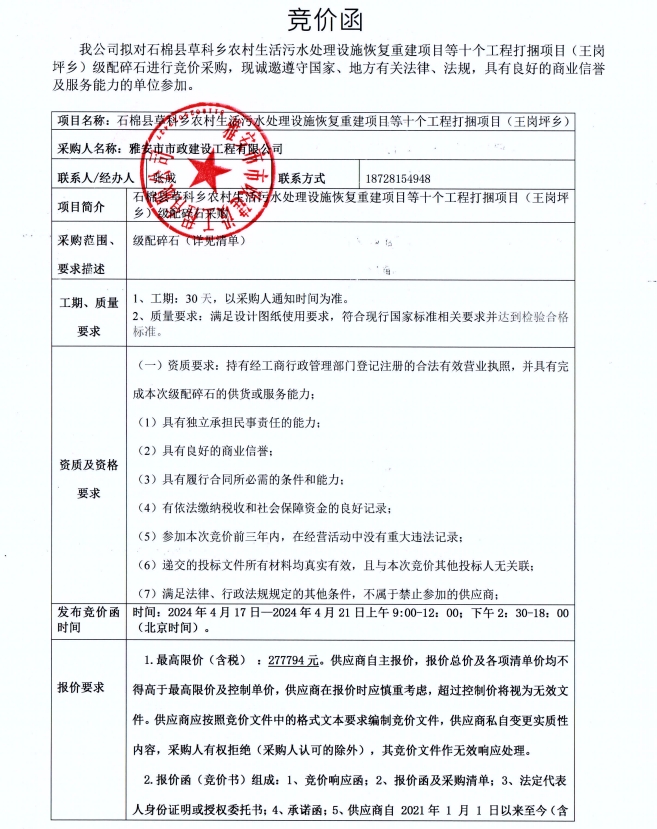石棉縣草科鄉(xiāng)農(nóng)村生活污水處理設(shè)施恢復(fù)重建項(xiàng)目等十個(gè)工程打捆項(xiàng)目(王崗坪鄉(xiāng))級(jí)配碎石競(jìng)價(jià)公告