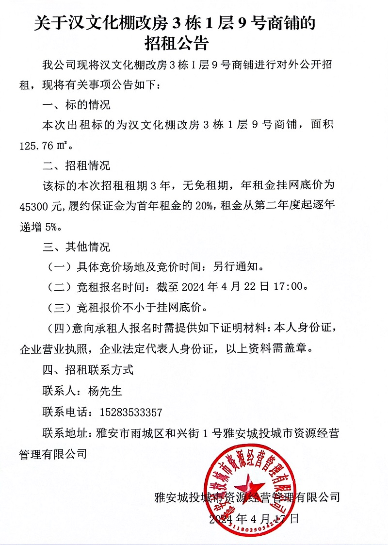 關(guān)于漢文化棚改房3棟1層9號商鋪的招租公告