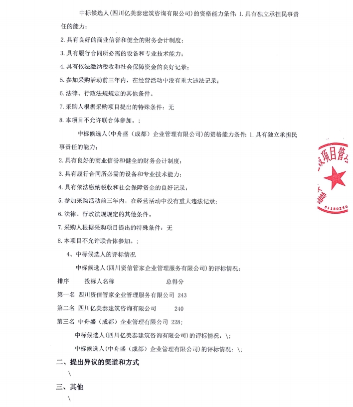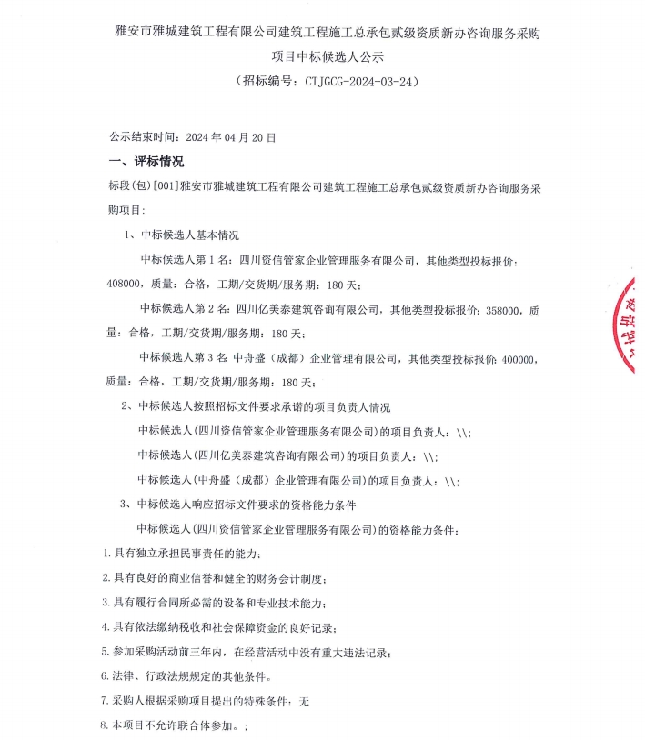 雅安市雅城建筑工程有限公司建筑工程施工總承包貳級(jí)資質(zhì)新辦咨詢服務(wù)采購(gòu)項(xiàng)目中標(biāo)候選人公示