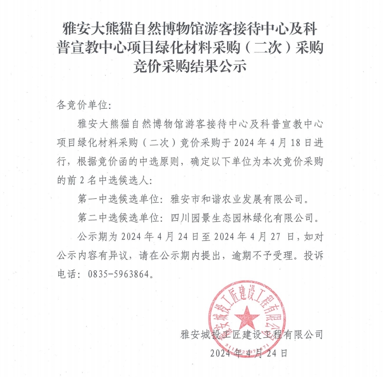 雅安大熊貓自然博物館游客接待中心及科普宣教中心項(xiàng)目綠化材料采購(gòu)(二次)競(jìng)價(jià)采購(gòu)結(jié)果公示