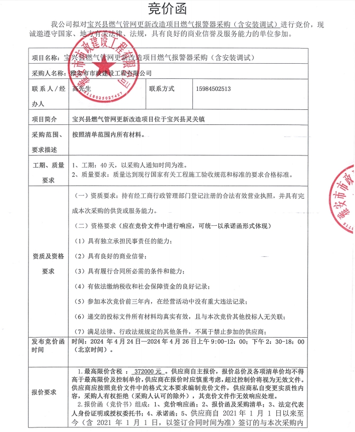 寶興縣燃?xì)夤芫W(wǎng)更新改造項目燃?xì)鈭缶鞑少彛ê惭b調(diào)試)競價公告