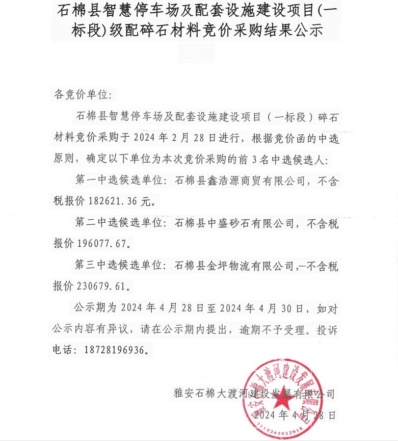 石棉縣智慧停車場(chǎng)及配套設(shè)施建設(shè)項(xiàng)目(一標(biāo)段)級(jí)配碎石材料競(jìng)價(jià)采購(gòu)結(jié)果公示