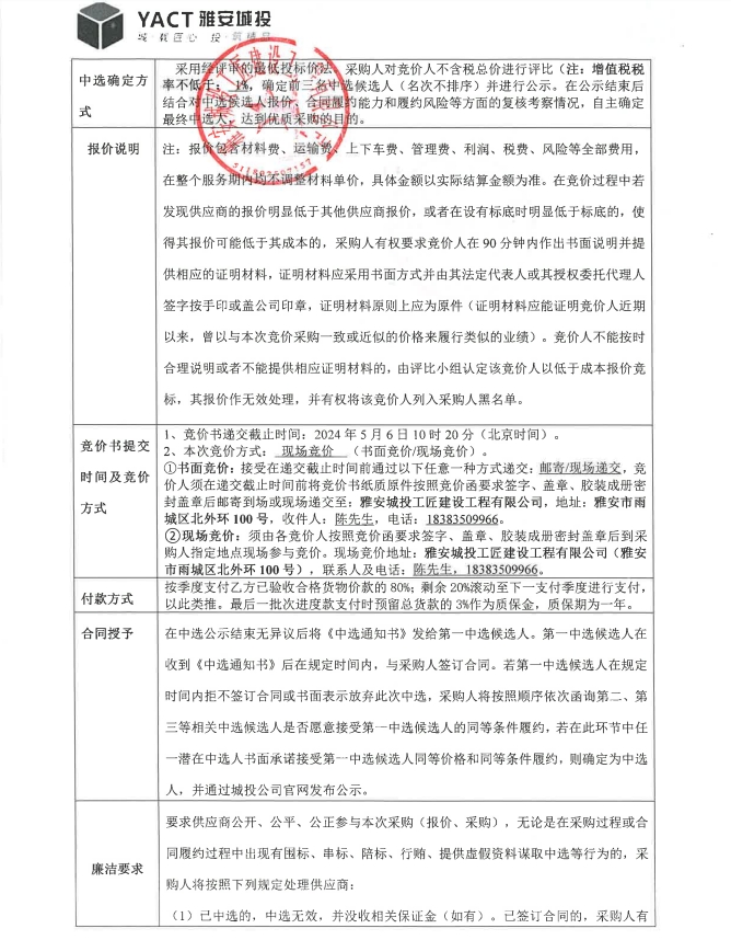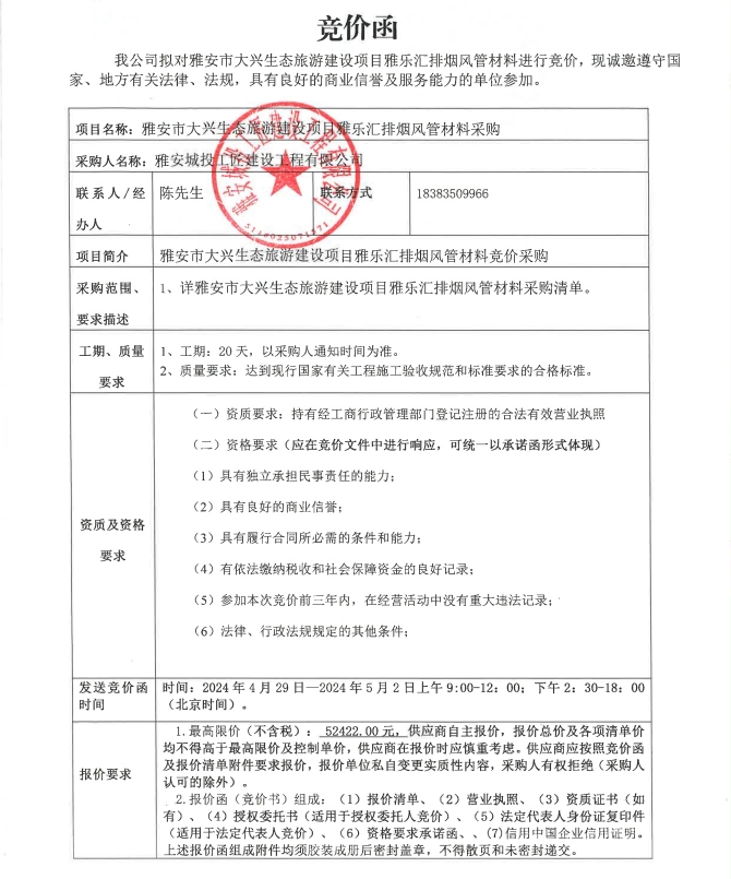 雅安市大興生態(tài)旅游建設(shè)項(xiàng)目雅樂匯排煙風(fēng)管材料采購(gòu)競(jìng)價(jià)公告