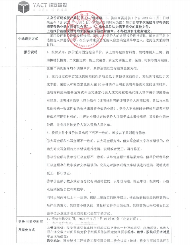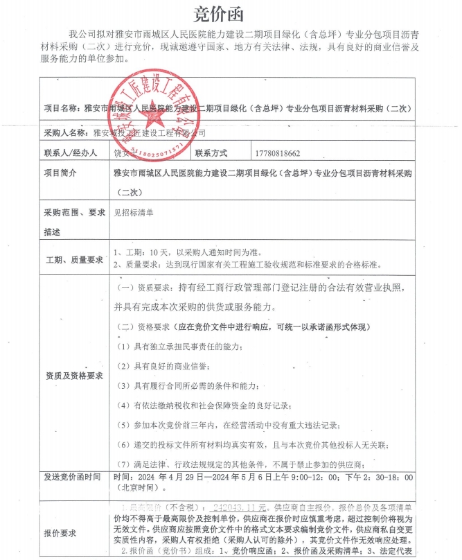 競價(jià)函-雅安市雨城區(qū)人民醫(yī)院能力建設(shè)二期項(xiàng)目綠化(含總坪)專業(yè)分包項(xiàng)目瀝青材料采購(二次)