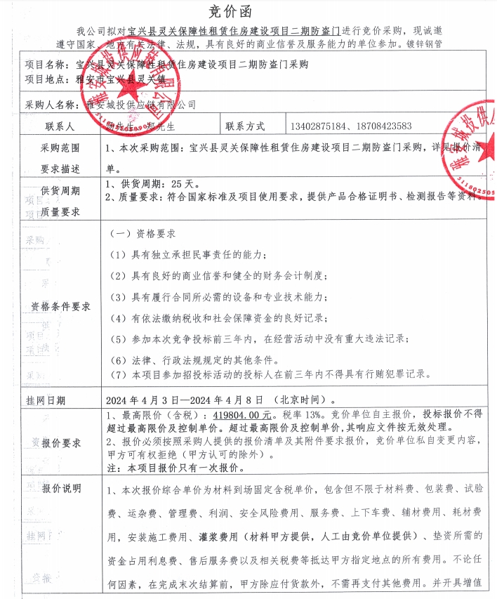 寶興縣靈關(guān)保障性租賃住房建設(shè)項目二期防盜門采購競價公告