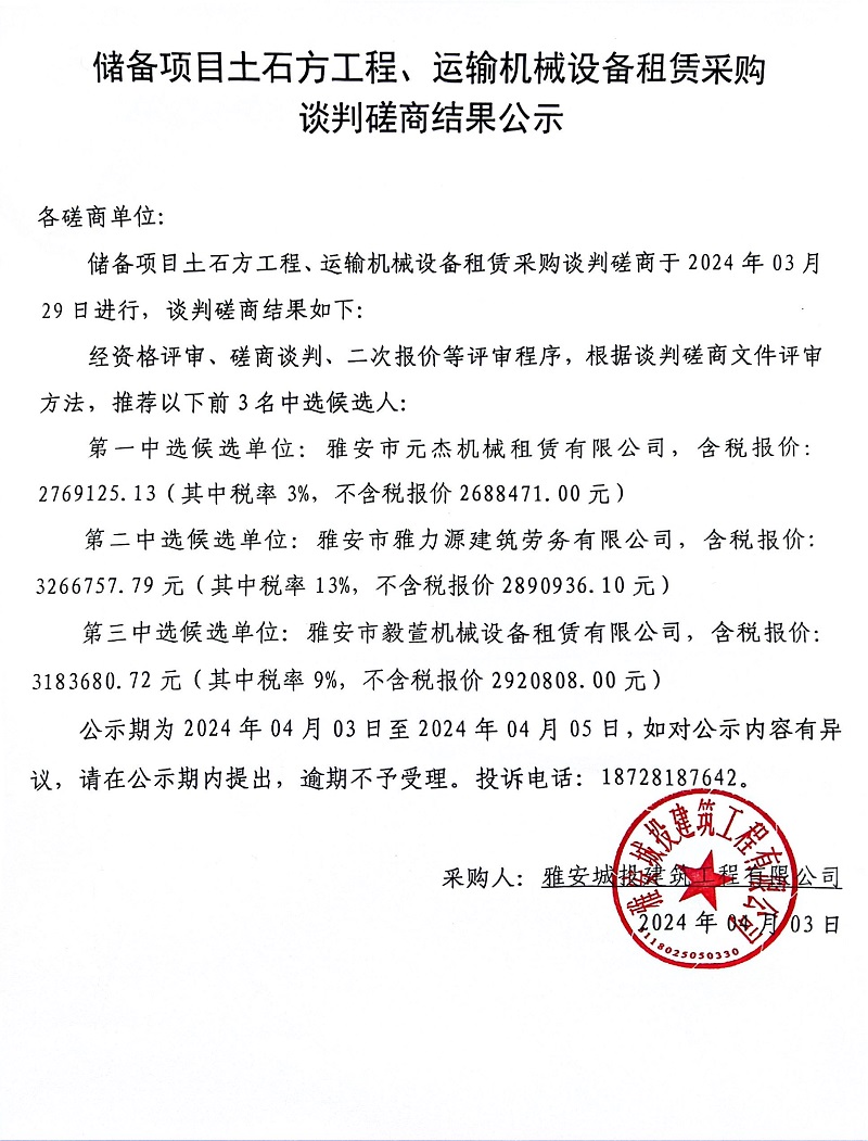 儲備項目土石方工程、運輸機械設備租賃采購談判磋商結果公示