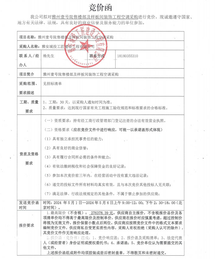 競價(jià)函-空調(diào)采購-雅州壹號院售樓部及樣板間