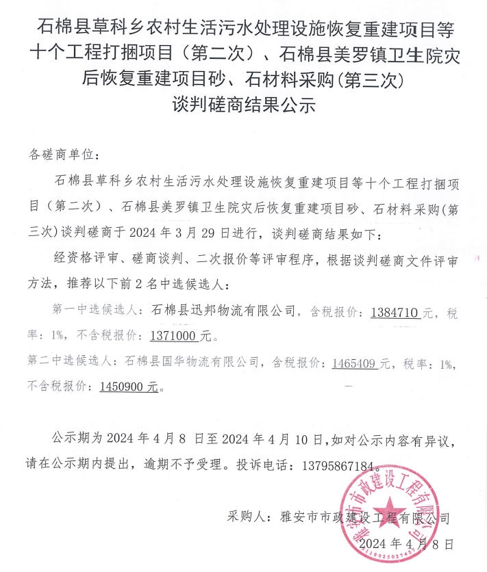 石棉縣草科鄉(xiāng)農(nóng)村生活污水處理設(shè)施恢復(fù)重建項(xiàng)目等十個工程打捆項(xiàng)目(第二次)、石棉縣美羅鎮(zhèn)衛(wèi)生院災(zāi)后恢復(fù)重建項(xiàng)目砂、石材料采購(第三次)談判磋商結(jié)果公示