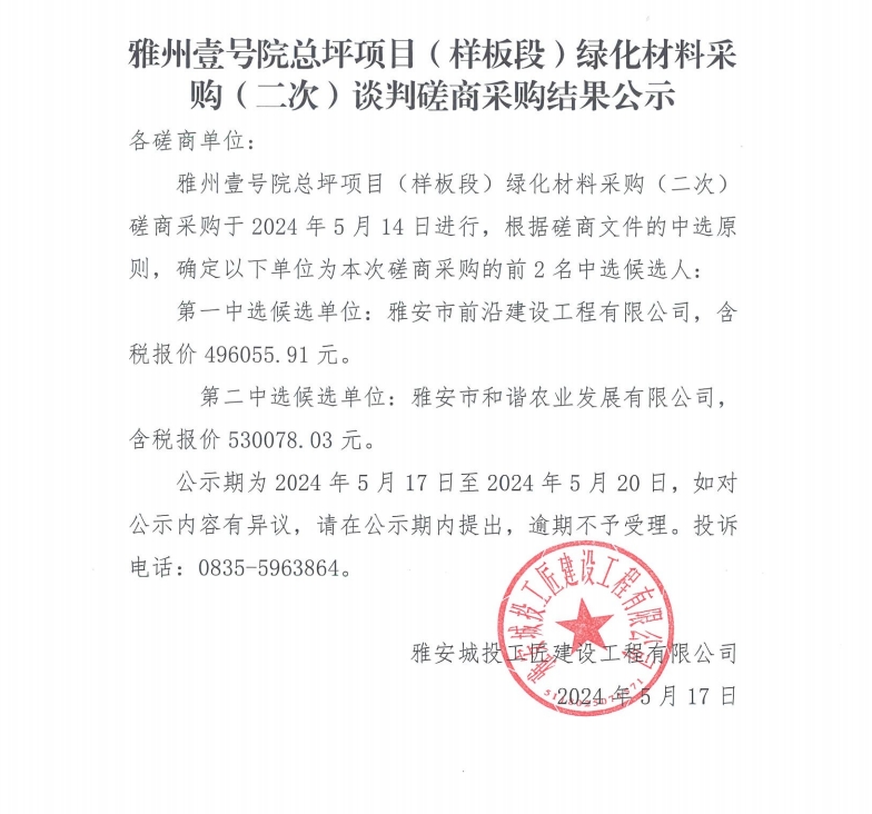雅州壹號(hào)院總坪項(xiàng)目(樣板段)綠化材料采購 (二次)談判磋商采購結(jié)果公示