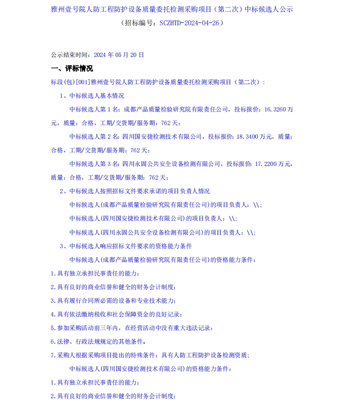 雅州壹號院人防工程防護(hù)設(shè)備質(zhì)量委托檢測采購項(xiàng)目(第二次)中標(biāo)候選人公示