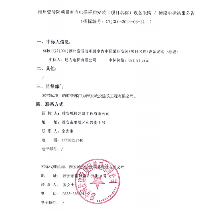 雅州壹號院項目室內電梯采購安裝(項目名稱)設備采購/標段中標結果公告