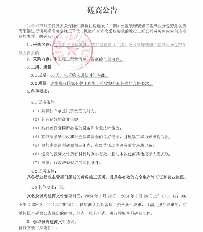 寶興縣靈關保障性租賃住房建設(二期)公區(qū)裝飾裝修工程專業(yè)分包勞務供應商采購談判磋商公告
