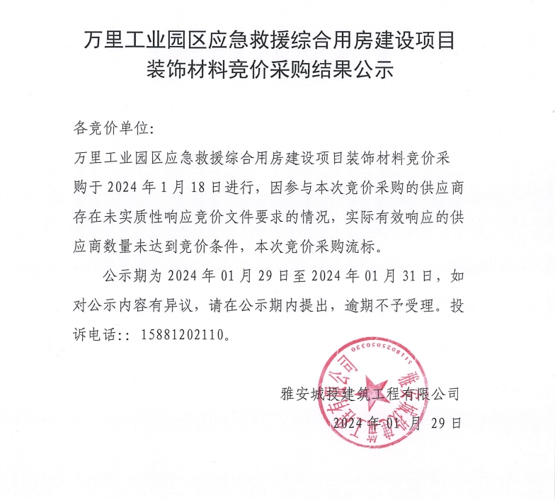 萬里工業(yè)園區(qū)應(yīng)急救援綜合用房建設(shè)項(xiàng)目裝飾材料競價(jià)采購結(jié)果公示