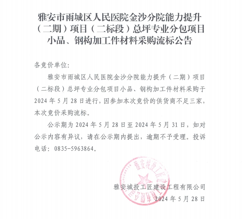 雅安市雨城區(qū)人民醫(yī)院金沙分院能力提升(二期)項目(二標(biāo)段)總坪專業(yè)分包項目小品、鋼構(gòu)加工件材料采購流標(biāo)公告